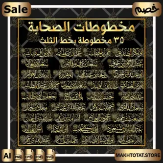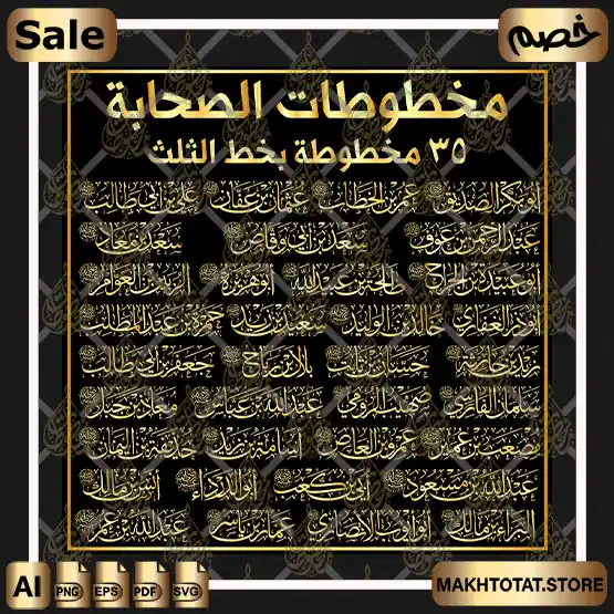 تعتبر حزمة مخطوطات أسماء الصحابة المورد الرقمي الأمثل والأكثر تكاملاً لكل مصمم جرافيك، مخرج فني، وصاحب مطبعة يبحث عن التميز في الأعمال الإسلامية. تضم هذه الحزمة المباركة 35 مخطوطة لأسماء 35 صحابي جليل (تشمل العشرة المبشرين بالجنة وأبرز قادة وعلماء الصحابة)، مجهزة بالكامل كـ فيكتور جاهز للقص والليزر لتلبية كافة الاحتياجات التجارية والدعوية.