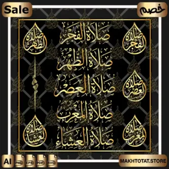 يبحث الكثير من المصممين عن مخطوطات الصلوات الخمس بجودة عالية لاستخدامها في مشاريعهم الاحترافية، لذلك نقدم لكم هذه المجموعة الفريدة من مخطوطات إسلامية جاهزة للتصميم والتي تشمل أسماء الصلوات بالخط العربي الأصيل. تم التصميم إلكترونيًا ،وتم تجهيز الملفات بصيغ فيكتور عالية الدقة لتتناسب تماما مع أعمال الموشن جرافيك وتلبي احتياجات أصحاب ورش تصميمات الحفر بالليزر. يجمع هذا العمل بين فخامة خط الثلث وانسيابية الخط الديواني ليوفر لك مرونة غير محدودة في إخراج لوحاتك الفنية والمطبوعات الدعوية بأفضل صورة.